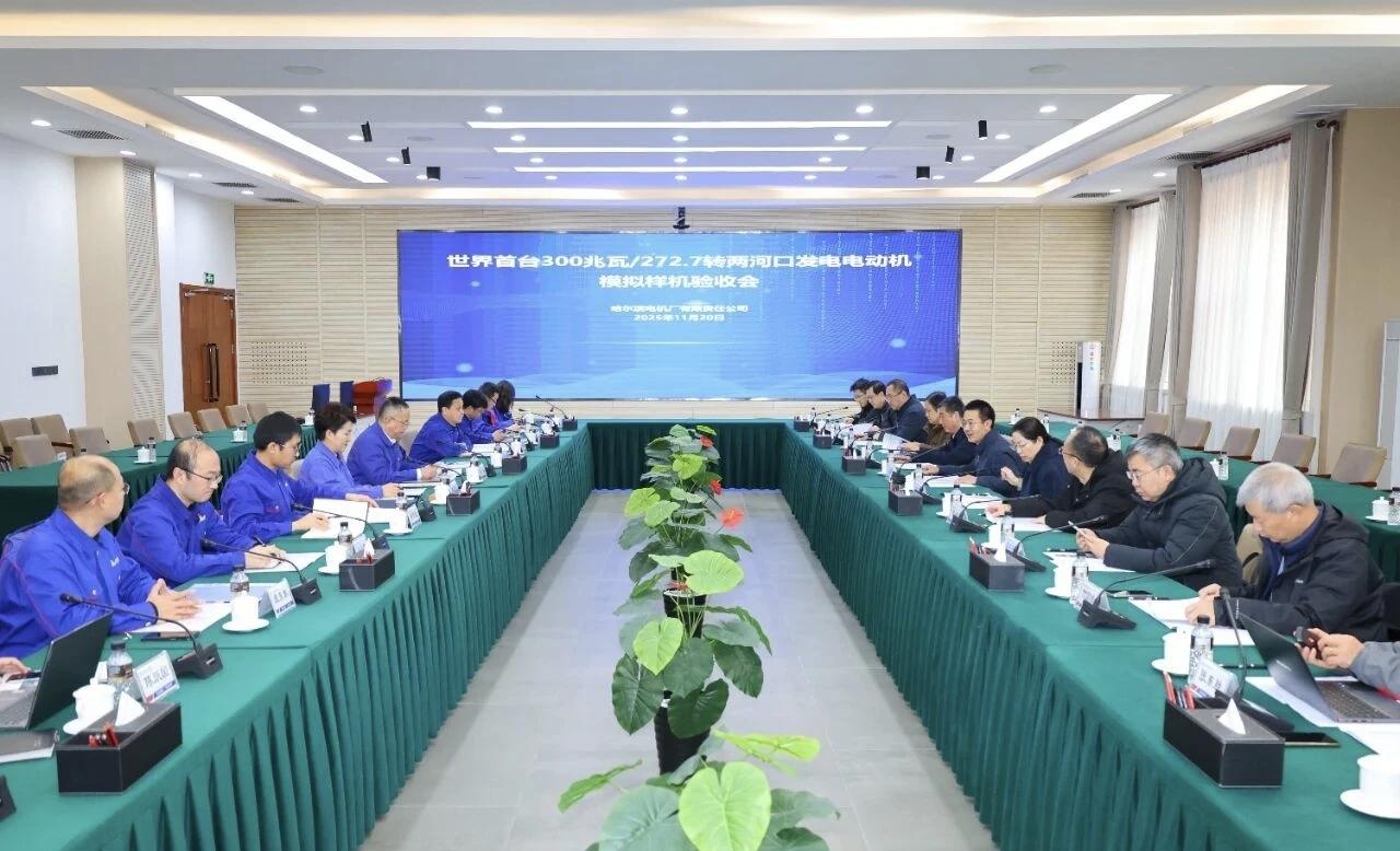 11月20日,由雅砻江流域水电开发有限公司组织的世界首台300兆瓦/272.7转抽水蓄能发电电动机模拟样机验收会议在哈尔滨召开。哈电集团电机公司为两河口抽水蓄能项目研制的模拟样机,经雅砻江公司、设计院、项目总承包方等单位的权威专家联合评审,一致认定:设计方案合理、理论分析充分、实测数据翔实,同意模拟样机通过验收,将填补行业300兆瓦/272.7转抽水蓄能发电电动机的型谱空白。