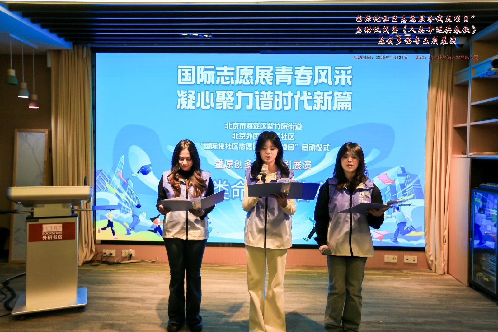 11月21日,北京外国语大学社区“国际化社区志愿服务试点项目”启动仪式暨《人类命运共春秋》原创多语音乐剧展演,在海淀区举办。活动由海淀区委社会工作部、海淀团区委指导,紫竹院街道办事处与北京外国语大学联合主办,吸引60余名中外嘉宾及学生志愿者参与。