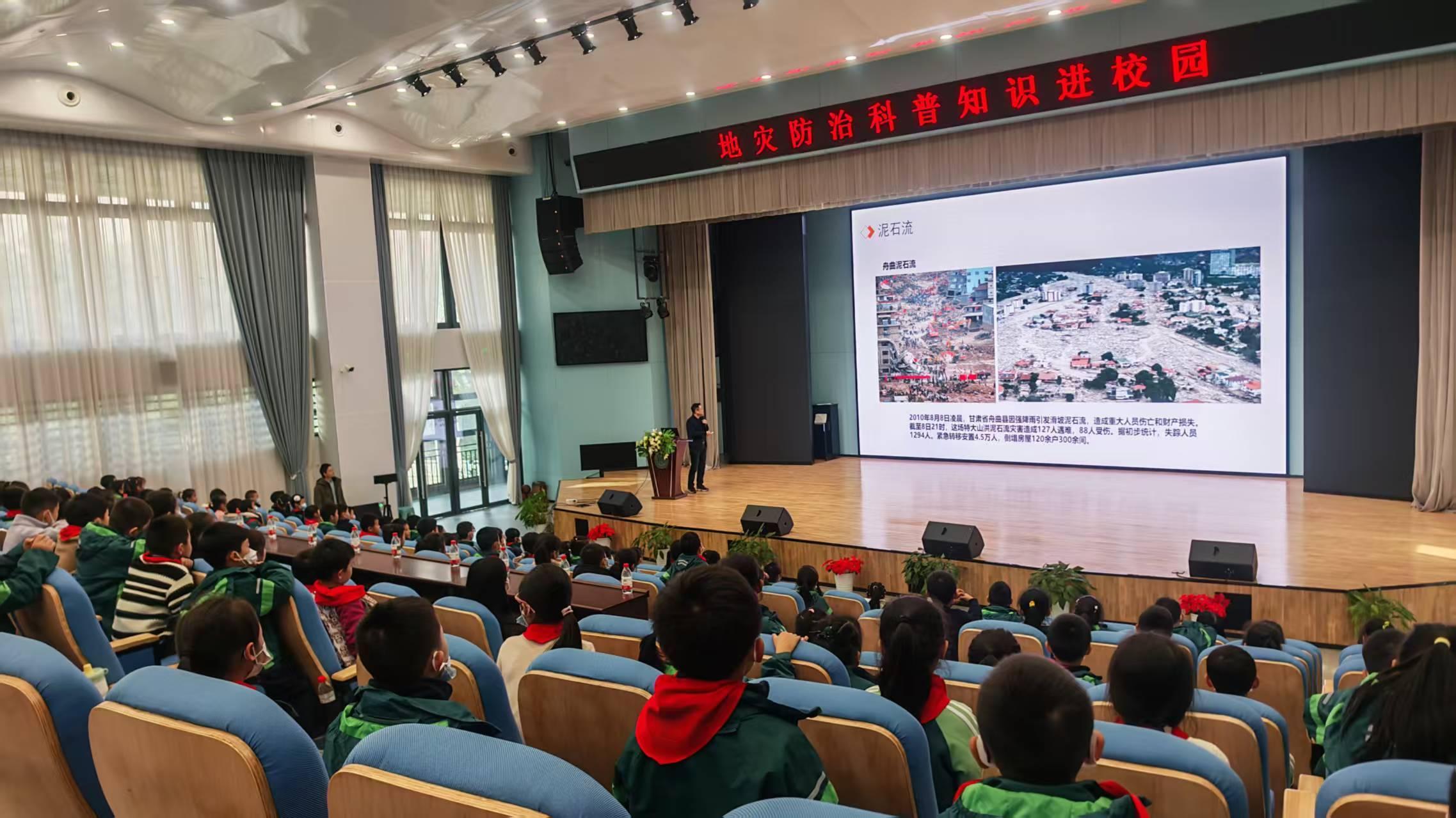 “泥石流来了该往哪躲?”“看到路边岩石掉块要怎么做?”在互动提问环节,主讲人抛出了8个贴近孩子们生活实际的防灾问题,学生们纷纷举手抢答,现场氛围热烈。答对的学生收获了精心准备的文具套装,未抢答成功的学生也在主持人的鼓励下积极思考,充分调动起主动学习的热情。现场参加活动的300名学生,每人得到了一本地质灾害科普绘本手册与定制尺子,让防灾知识不仅“听进去”,更能“带回去”“用起来”。