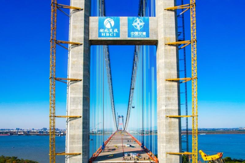 大桥建设过程中,湖北交投集团与“建桥国家队”共谋共建,大力推动四主缆悬索桥施工关键技术研究和桥梁智能化建造成套技术研究与应用。使用全国最大最强的SWD1200超级旋挖钻,并对钻头进行适应性改造,破解跨地质断裂带大直径群桩基础施工难题;研发一体化智能筑塔机,集成双泵管智能布料系统、智能蒸养及振捣系统,解决超厚壁高强大体积混凝土浇筑及温控防裂难题。