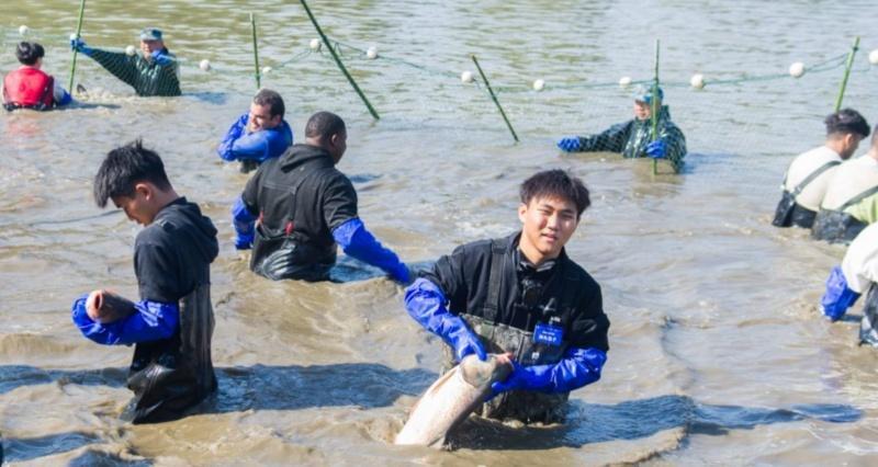 “一二一加把劲,匀匀发力向后拉。”沁湖畔,拉网号子铿锵有力。30余名中外学子统一着装,双手紧握缰绳,一致侧身向后倾斜,协力拉网。持续一小时努力,一张长达350余米的渔网渐渐收紧,满眼鱼儿翻腾扑跃。引得岸上师生纷纷拍手叫好,跃跃欲试下水捉鱼。