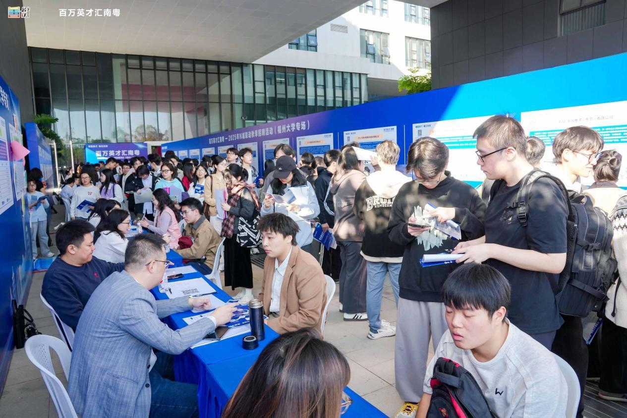 11月23日下午,“百万英才汇南粤”2025年N城联动秋季招聘活动在福州大学旗山校区晋江楼广场举办。线下活动现场共吸引超5000名学子入场求职,投递简历1793份,初步达成就业意向近728个,线上“直播带岗”100458人次参与,直接投递简历3838份。