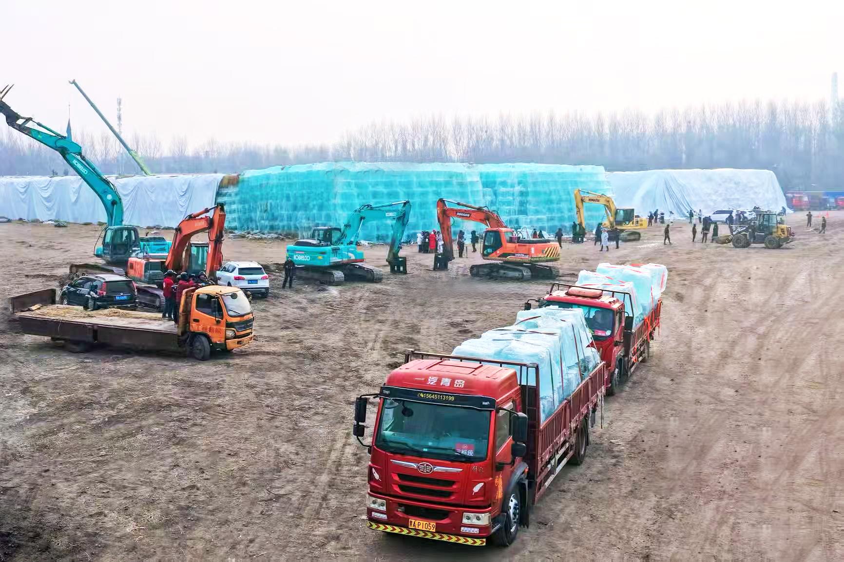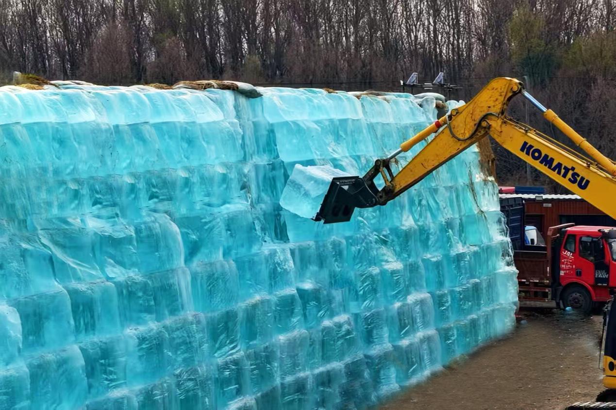 14时30分,哈尔滨冰雪大世界存冰场内,作业车辆在冰垛间忙碌穿梭。随着吊车、铲车、叉车接力作业,冰垛上的冰体被一块块拆解下来。