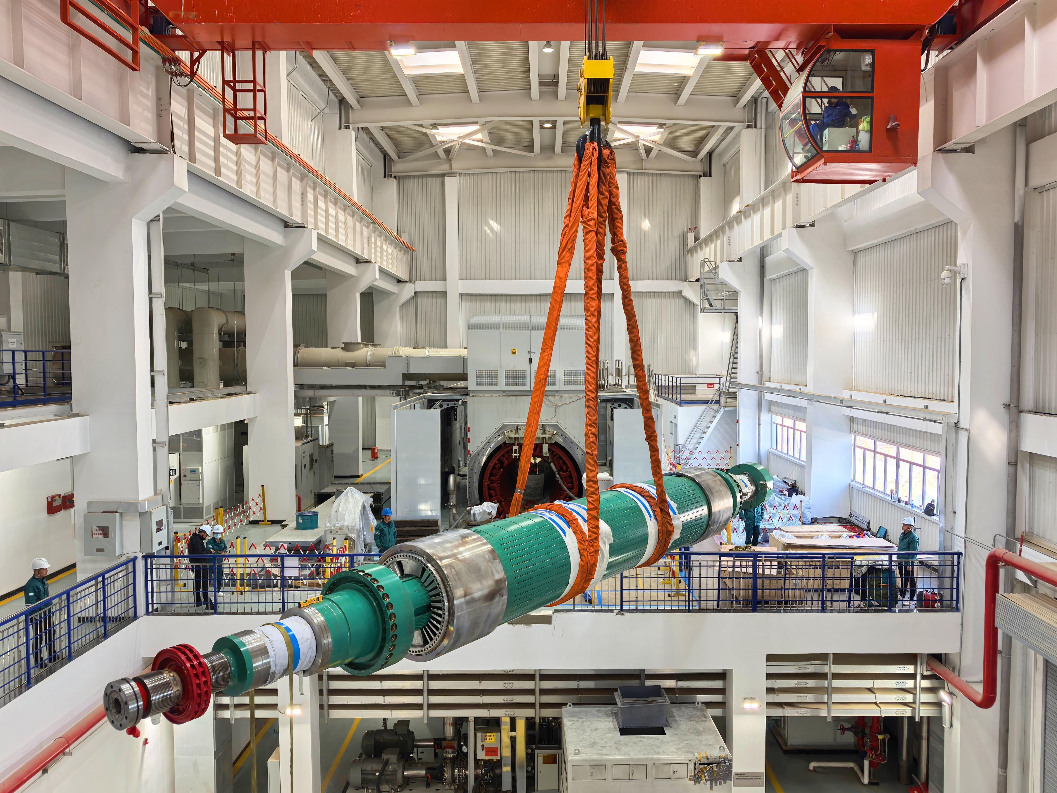 2024年10月,青南换流站1号调相机转子引线出现异常,需返厂检修。单根转子重83吨,长14米,若返回原厂所在地,往返运输里程超6000千米,运输难度大、耗时长、风险高,修复周期至少一个半月,影响青海新能源外送效率。对此,国家电网公司组织相关单位开展分析研究,创新采用就近检修方案,利用青海高海拔特高压检修试验基地开展检修,并在换流站内利用定子膛替代原厂的超速间作为试验场地,进行转子动平衡试验。“检修显著提升了应急响应速度和设备可用率,为后续关键设备就地检修积累了宝贵经验。”青南换流站党支部书记张彦军介绍。