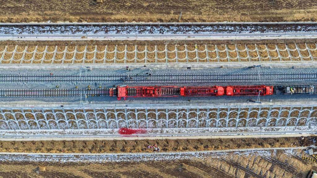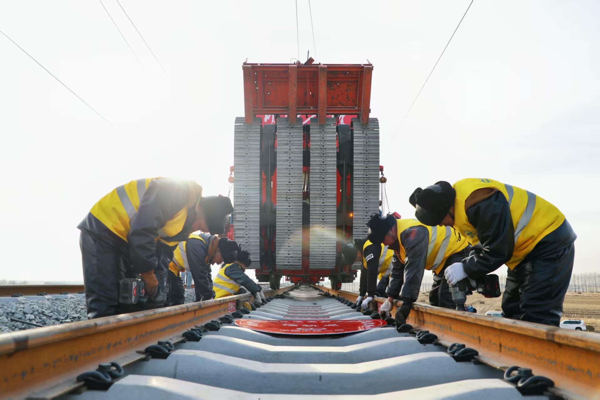 11月25日,在黑龙江省绥化市庆安县永华村哈伊高铁哈铁段铺轨现场,中铁二局集团公司四名工人手持电动扳手,将最后一对钢轨螺栓拧紧,标志着“十四五”重点工程哈伊高铁全线铺轨贯通,为后续联调联试奠定基础。