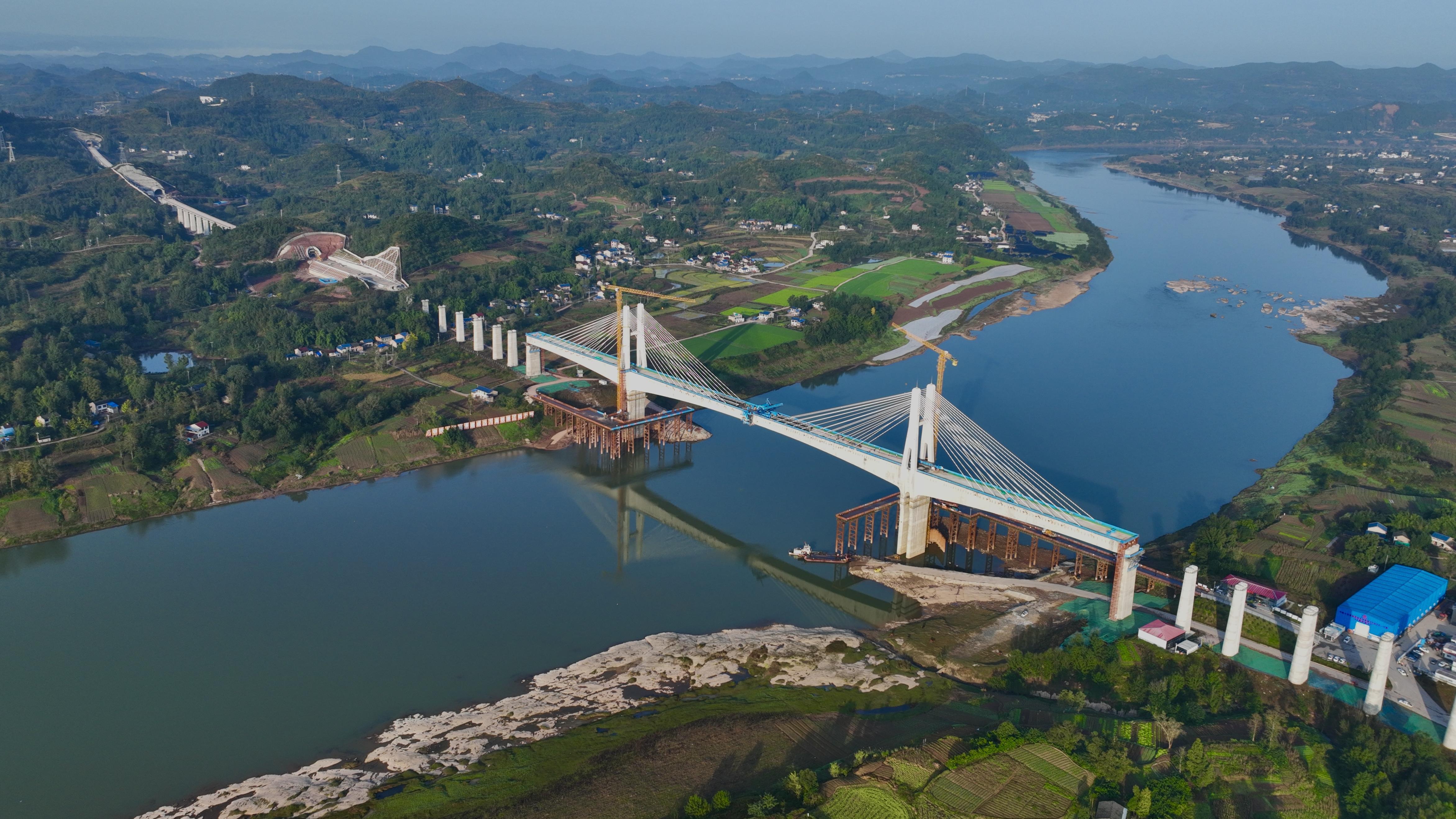 渠江特大桥位于四川省达州市渠县境内,是全线“4隧4桥”重难点控制性工程之一,全长1983.81米。该桥主桥为预应力混凝土矮塔斜拉桥,全长557.5米,主跨278米,是世界跨度最大的双线高速铁路预应力混凝土矮塔斜拉桥。