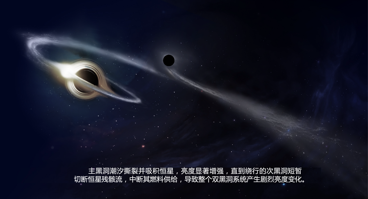 “XID 935的光度在整体下降的过程中,还出现了突然变暗又变亮的情况——两个月内变亮超过27倍。这种现象预示着可能是一例发生在超大质量双黑洞系统中的潮汐撕裂恒星事件。”薛永泉解释,与普通的单黑洞潮汐撕裂恒星事件不同,当一颗恒星被主黑洞撕裂,恒星残骸流可能会被次黑洞干扰,导致无法正常回落到主黑洞,物质供给的中断导致光度骤然下降;当次黑洞远离后,恒星残骸流又能正常回落到主黑洞,于是主黑洞继续吸积残骸从而恢复光度。