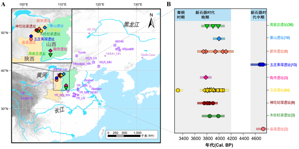 石峁遗址地处黄土高原与毛乌素沙漠的交界带,是中国已知规模最大的史前城址,其复杂的城防布局、多元的祭祀遗迹与高等级的文物遗存,展现出典型的早期国家形态与高度的社会复杂化程度。然而,关于该遗址及相关文化人群的遗传来源,与周边黄河流域、草原人群之间的联系及其采取的社会组织形式等科学问题长期存在争议。对此,针对石峁遗址与周边古人群展开大规模、系统而精细的核基因组研究,成为解答这些问题的关键手段。