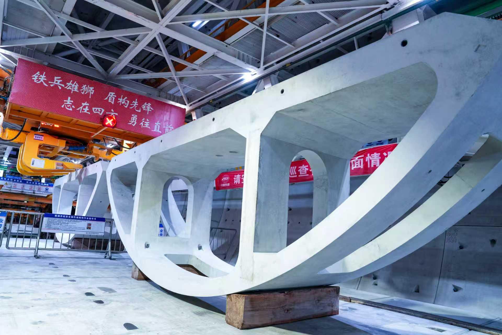 铁四院天祥隧道设计负责人许建介绍,针对这一特殊情况,设计团队开展全断面超大直径盾构隧道设计、结构防水一体化设计等关键技术创新,为高风险隧道的安全高效建设提供了坚实技术支撑。同时,隧道轨下结构创新采用“整体全预制箱涵”拼装技术,这是该项技术首次在高速铁路隧道中应用,将高速铁路隧道预制化进程推向了新的高度。由于天祥大道隧道地质稳定性差,采用传统爆破或明挖施工易引发塌方、沉降,给施工带来较大困难。