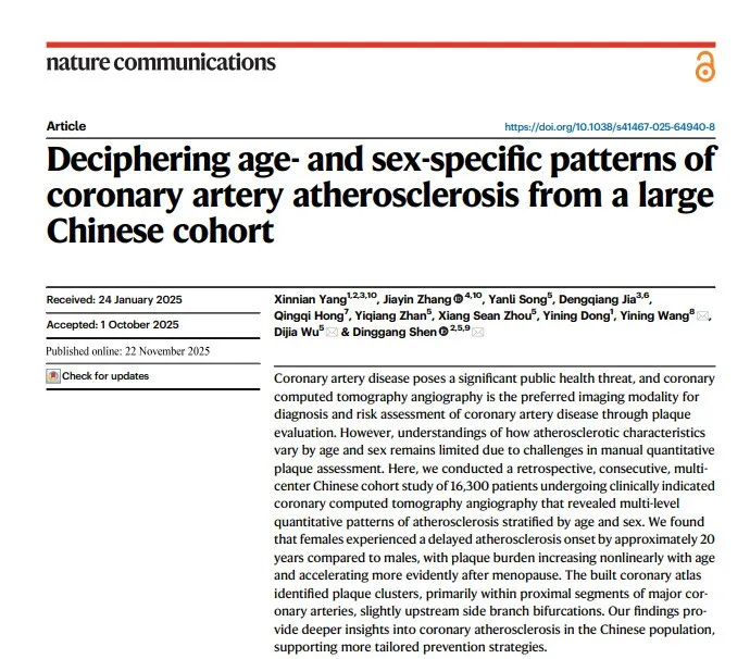 上海科技大学、香港城市大学、上海交通大学医学院附属第一人民医院、北京协和医院等单位的研究人员,基于1.63万例接受冠状动脉计算机断层扫描血管造影(CCTA)检查的患者,首次构建了中国人群冠脉斑块空间图谱,解析出冠脉粥样硬化年龄、性别相关特征,为本土诊疗提供了关键循证依据。相关成果11月22日发表于《自然·通讯》。