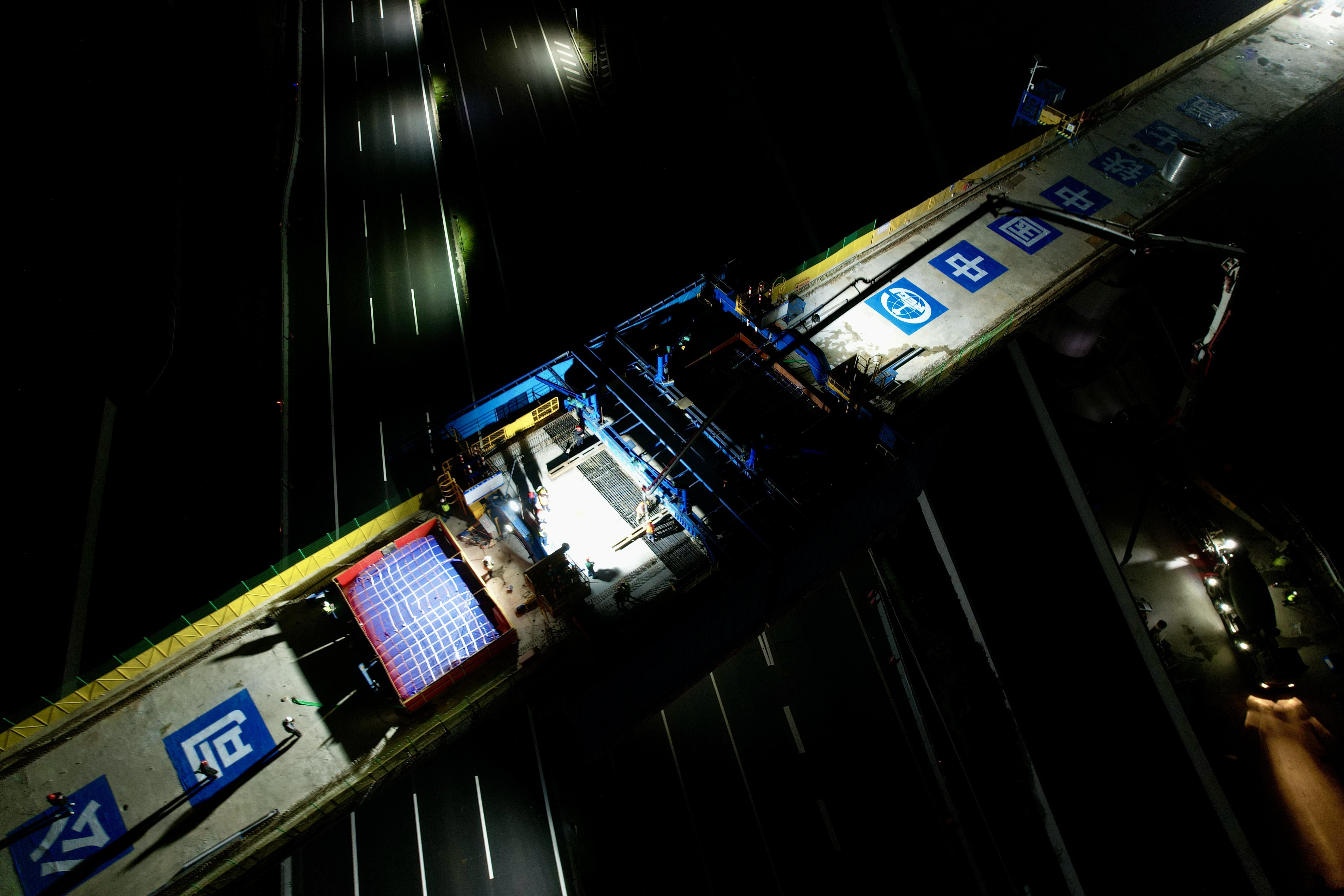 海盐特大桥跨杭浦高速连续梁全长221.7米,处于架梁通道的关键线路上,也是通甬高铁Ⅸ标重难点控制性工程。该桥梁位于杭浦高速上方,高速上来往车流量大,具有组织协调难、安全风险高、施工难度大等困难。施工过程中,建设团队创新采用了集承重杆件、全自动液压模板、自动调节、自动走行、吊装、智能监测、全方位防护、自动喷淋、智能语音报警等九大智能系统的造桥机。