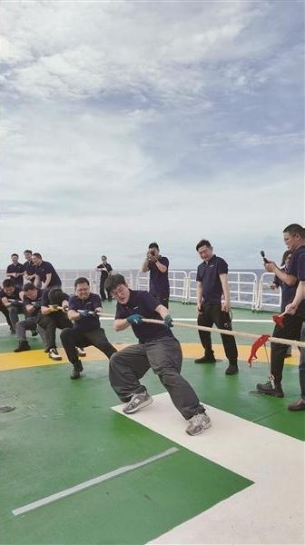 11月11日,久违的太阳露了头,跨赤道仪式的传统项目拔河得以举办。一开始抽签,“雪龙2”号船员队和中山度夏工程队两支传统强队在初赛就狭路相逢。伴着一声清脆的锣响,队员们努着劲拼命拽紧绳子,不愿让出分毫。“一二,一二!”“雪龙2”号船员队整齐地喊着口号,气势高涨,一鼓作气将绳子拽过裁判线。