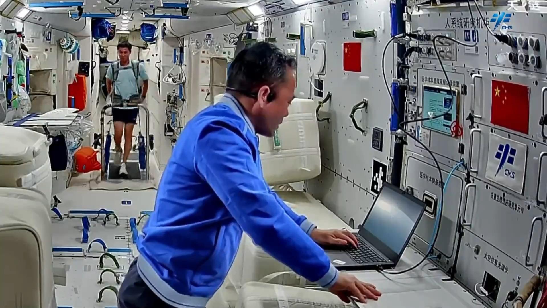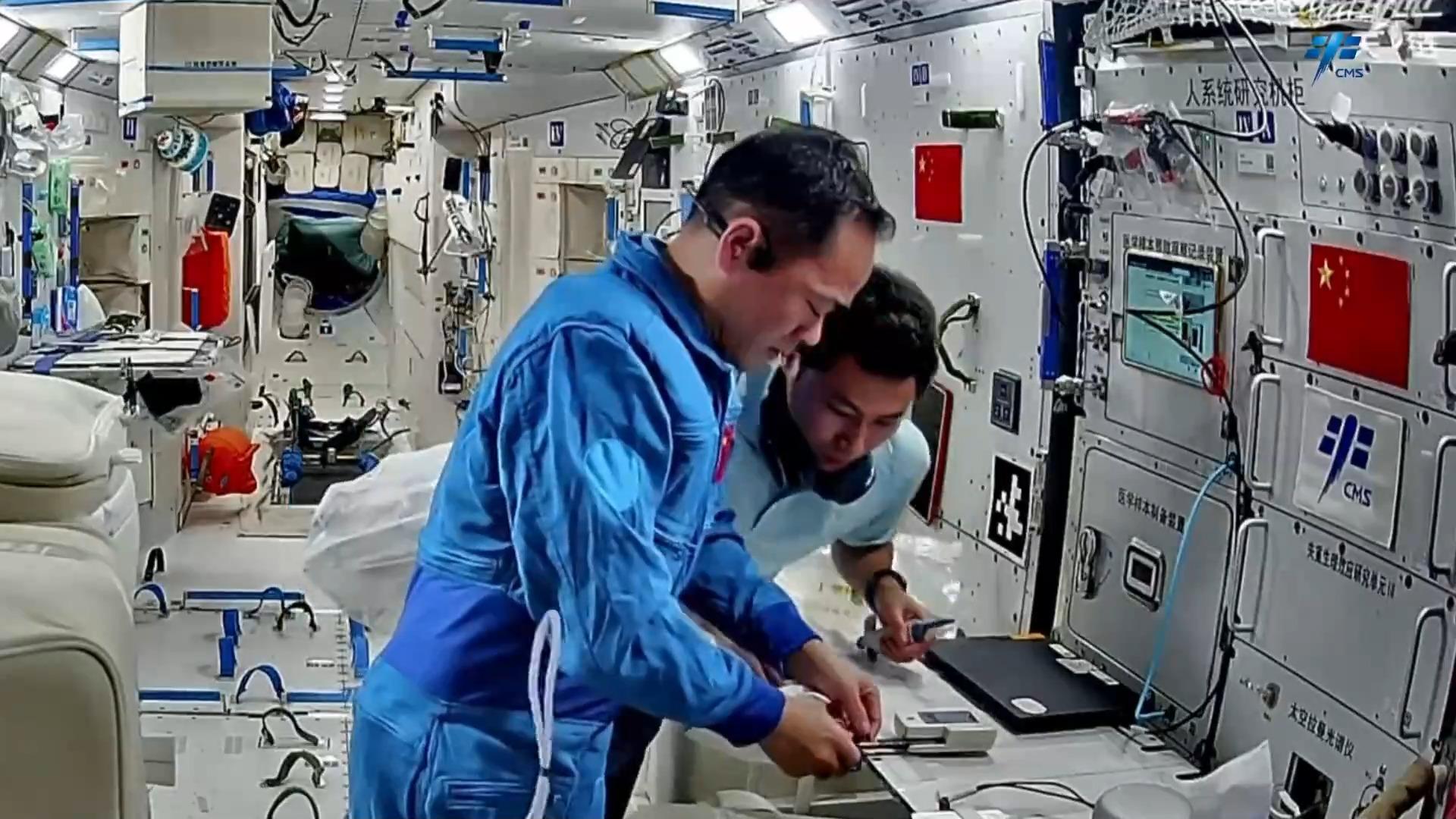 利用太空拉曼光谱仪,对尿液样本中的代谢组分进行检测,所采集信息将用于进一步修正和完善相关特征代谢物指标体系和评判准则。此外,乘组完成了航天医学实验领域新上软件安装工作。