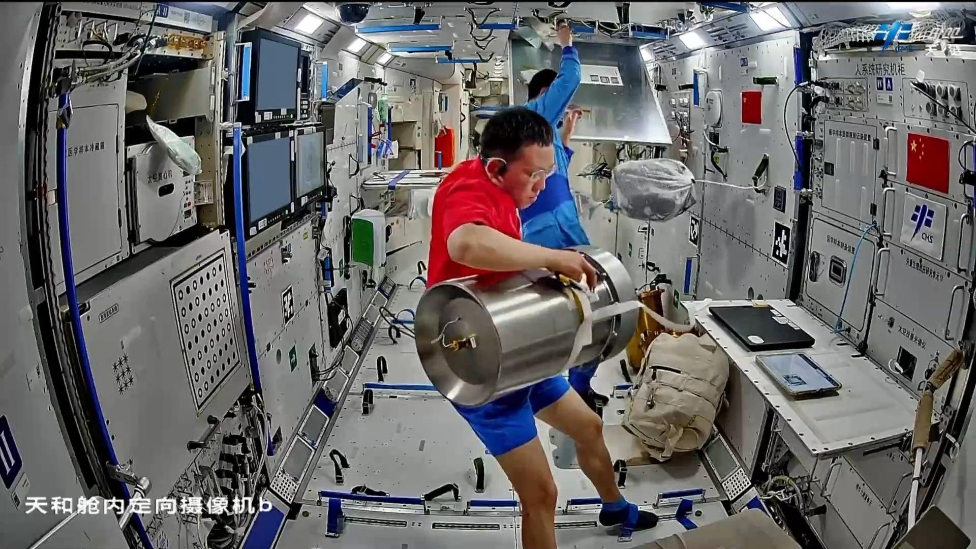 在设备检查维护方面,乘组开展了低温存储装置及-80℃空间冰箱巡视、环控气瓶压力检查、再生生保系统设备维护等工作。