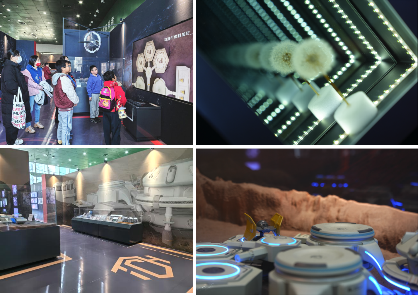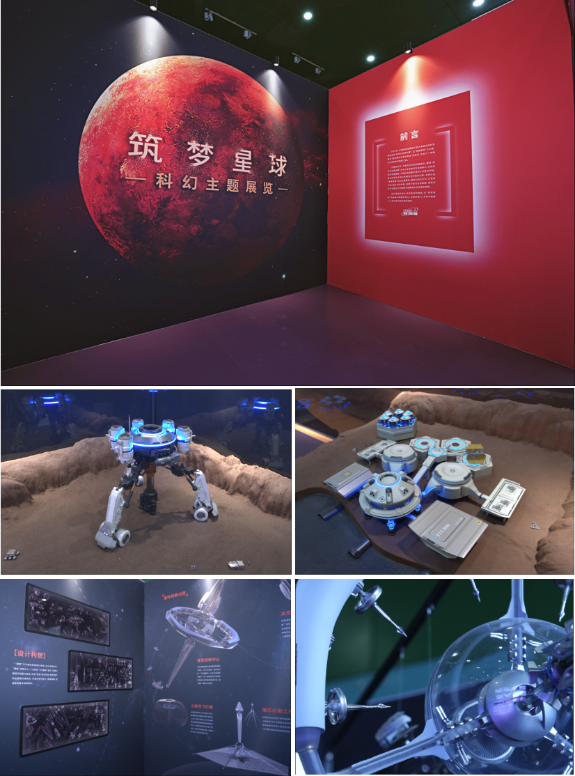 展览聚焦未来行星改造、能源利用与星际旅行三大核心方向,设置“荧惑探针——火星大气改造计划”“泰坦星燃料基地——星际远航的补给站”“蒲宫——星际探索的移动母舰”三大展区。在“荧惑探针”展区,观众可通过图文与沙盘模型,直观感受人类以精准技术重塑火星大气的科幻场景;“泰坦星燃料基地”展区则呈现了甲烷燃料为星际航行提供不竭动力的未来图景;“蒲宫”号移动母舰的互动装置,让青少年仿佛置身星际研学之旅,在互动中体悟探索精神。浪漫恢宏的视觉设计、立体精致的模型制作与趣味十足的互动体验,使抽象的科学构想转化为可感可知的展览内容。