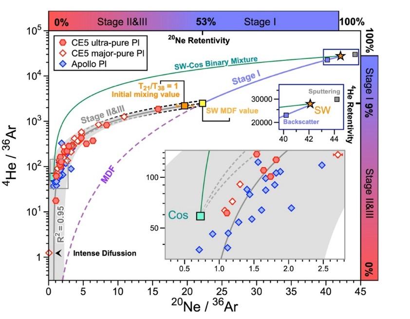 基于此,科研人员提出了一个三阶段模型来解释月球表面稀有气体的行为——太阳风及宇宙射线注入、局部热扩散以及再次被辐照。该模型表明,太阳风注入与气体逃逸是相互关联的过程:一部分轻元素在撞击时可能因矿物微损伤而瞬间释放,进入月球外逸层;微陨石撞击和昼夜温差则会进一步促使气体扩散逃逸,造成不同颗粒间气体含量的显著差异。