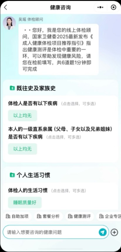 《指引》明确强调健康问卷在体检中的重要作用,并对问卷内容进行了更新,旨在通过个体化风险评估提升体检的精准性和有效性。用户预约体检服务后,将由专属副主任医师领衔的线上体检医生团队主动介入通过APP在线咨询沟通,医生不仅会引导用户完成新版标准化健康问卷,还会结合其生活方式、既往病史及家族遗传等信息,进行专业风险评估,并据此制定个性化体检方案。京东健康相关负责人表示,这一举措显著提升了体检项目的针对性与临床价值,实现“因人施检”。