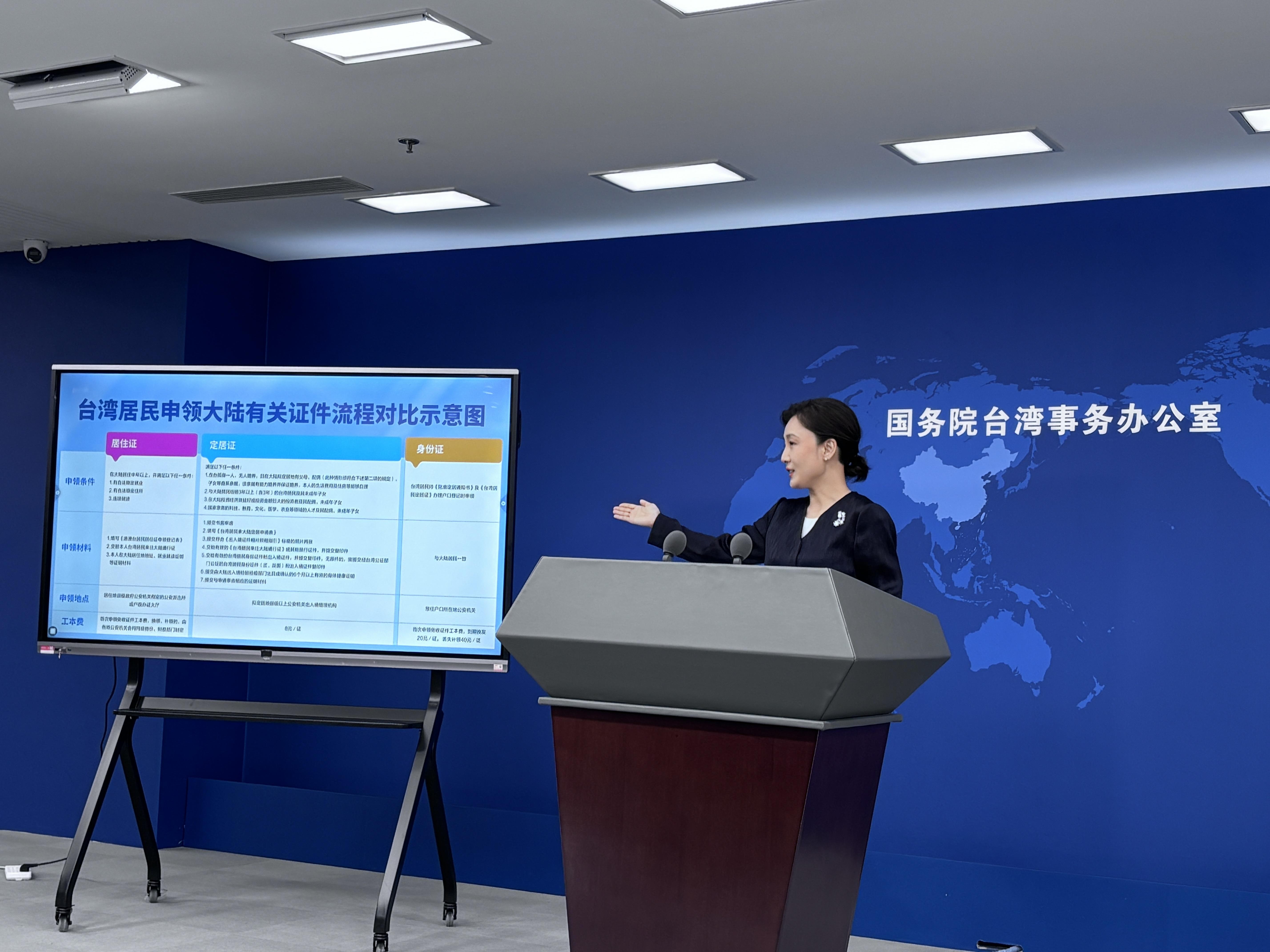 张晗表示,在此,我还要再强调几点。一是台湾居民申领上述证件完全是自愿行为;二是我们也注意到,一些不法机构在网上虚假宣传可为台湾居民代办大陆身份证并借机牟利,我要提醒广大台胞,在申领上述证件过程中,除办证机构收取证件工本费外,其他任何非官方机构和人员以代办、中介等名义提供有偿服务的行为都是非法和违规的,要谨防上当受骗;三是大陆相关主管部门在受理、审核、批准过程中,将依法严格保护台湾居民有关申请材料,不会泄露当事人个人资料和证件信息。我也再次提醒广大台湾同胞,要妥善保管好证件及个人隐私信息,以防外泄。