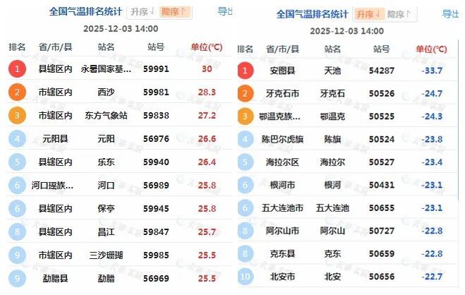 而在降温不明显的广东、海南等地,午后气温还在20℃以上。海南三沙的永暑站甚至达到30℃,与吉林长白山天池-33.7℃形成鲜明反差,同一天我国南北温差超过了60℃。