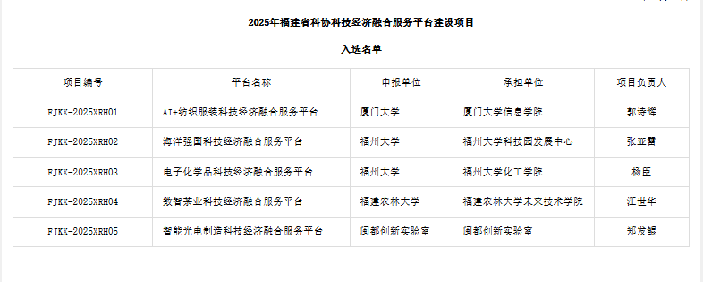 此次遴选出的新一批科技经济融合服务平台包括:AI+纺织服装科技经济融合服务平台(申报单位:厦门大学)、海洋强国科技经济融合服务平台(申报单位:福州大学)、电子化学品科技经济融合服务平台(申报单位:福州大学)、数智茶业科技经济融合服务平台(申报单位:福建农林大学)、智能光电制造科技经济融合服务平台(申报单位:闽都创新实验室)。