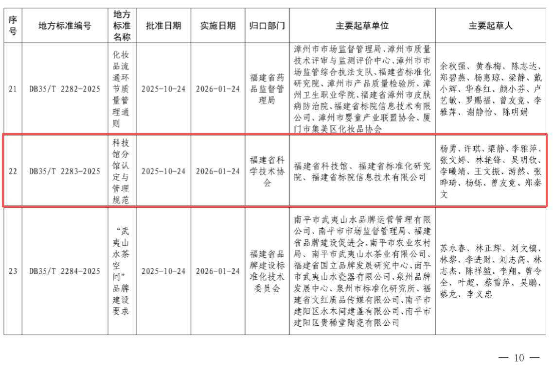 近日,由福建省科技馆牵头研制的福建省地方标准《科技馆分馆认定与管理规范》(DB35/T 2283-2025)经福建省市场监督管理局批准正式发布,将于2026年1月24日起实施。该标准归口于福建省科协,是全国首个针对科技馆分馆建设与管理的省级地方标准,标志着福建省科技馆总分馆制建设迈入标准化、规范化的新阶段。