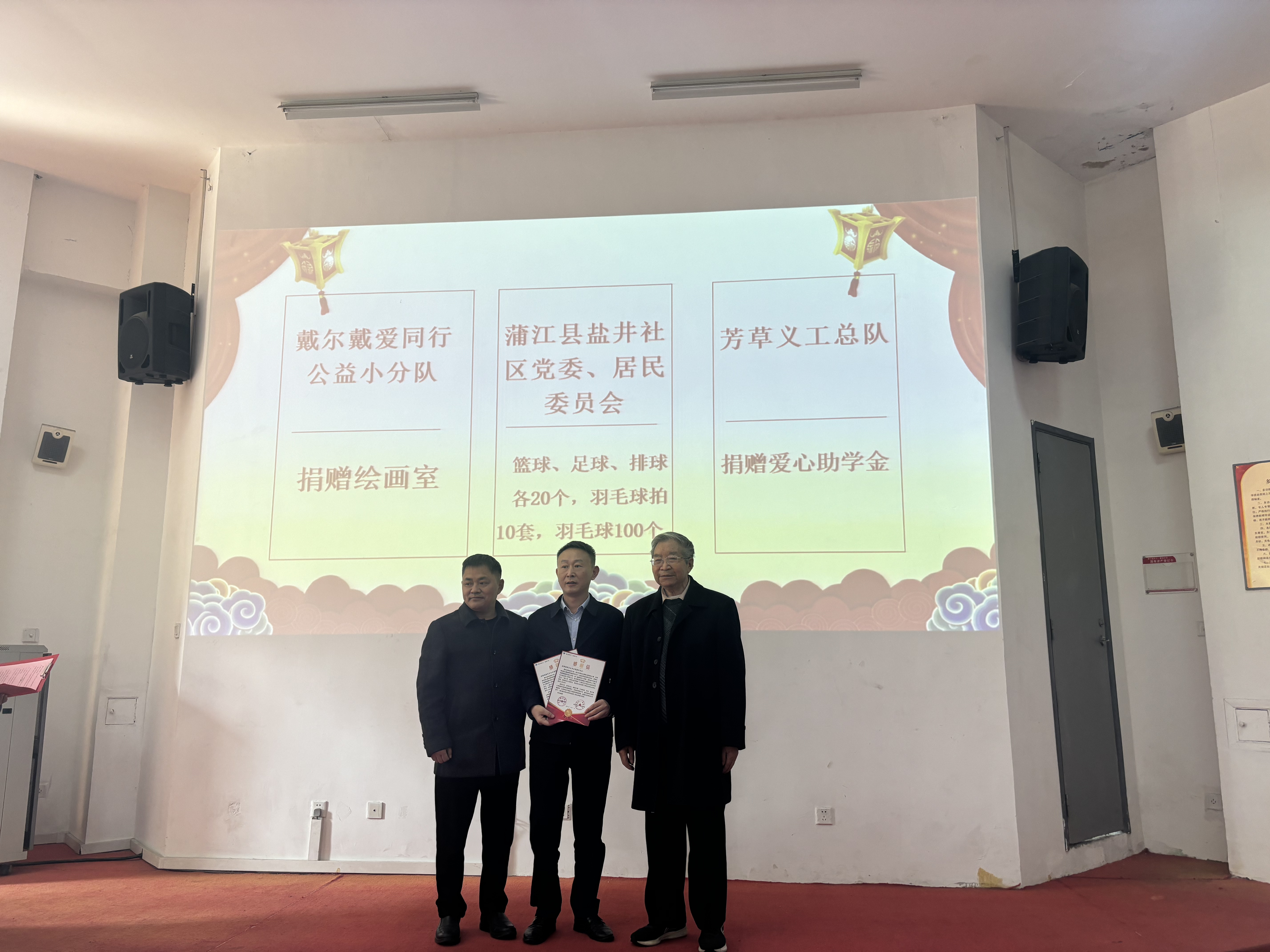 捐赠仪式上,戴尔戴爱同行公益小分队捐赠了绘画室全套配套设施;蒲江县盐井社区党委及居民委员会捐赠篮球、排球、足球各20个,羽毛球拍10套、羽毛球100个;芳草义工总队定向捐助爱心助学金。活动现场,成都市道德模范、成都高新区芳草义工总队队长虎永芳作《生命不息,公益不止》主题宣讲,成都市修齐家庭教育公司经理王万林围绕《家庭教育是家校社共育的关键》开展专题分享。