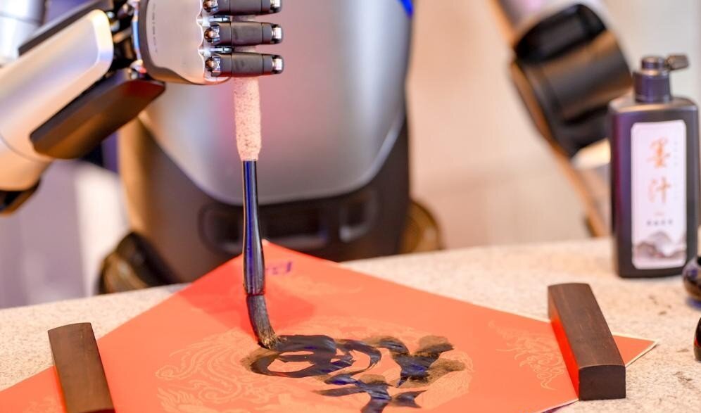均普机器人研究院自主研发的人形机器人“贾维斯”,在现场化身“科技儒匠”,挥毫泼墨,创作书法作品……