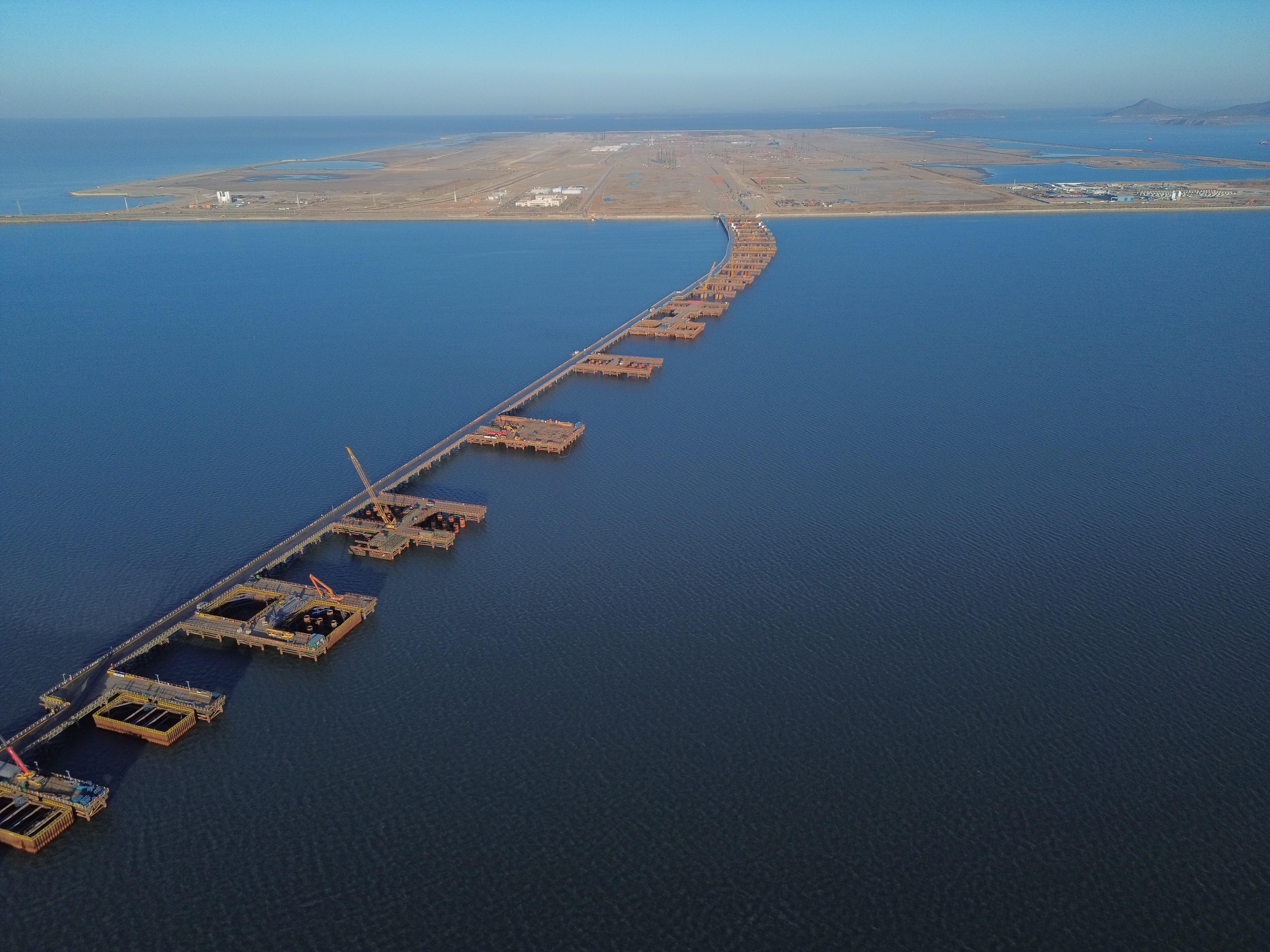 全国首个离岸式“人工岛”机场重点配套工程——大连新机场中线主通道跨海段工程施工现场航拍图。