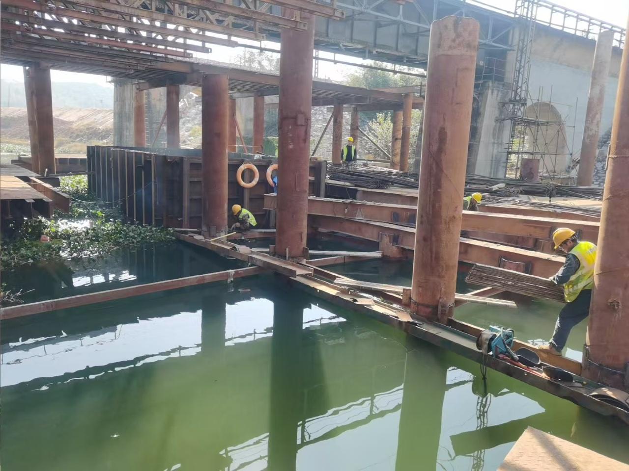 此次施工核心任务是将长11.02米、宽5.82米、高9.5米的钢吊箱围堰,在湍急水流中精准落位至设计标高。该构件重达75吨,水流冲击下易偏移变形,毫米级精度控制成为核心难点。中铁六局以“技术创新+精细管理”破局,施工中采用“北斗导航式”定位系统,通过钢护筒预埋、导向孔对接及底部锁固结构严控水平位移,最终实现毫米级精准着床。