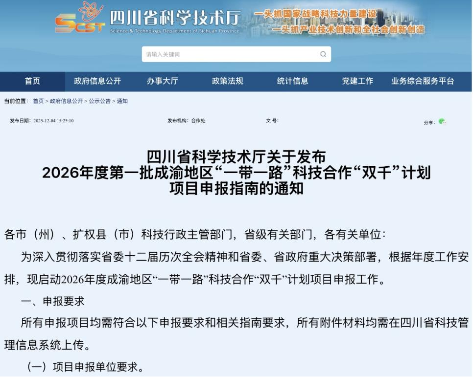 近日,四川省科学技术厅发布《2026年度第一批成渝地区“一带一路”科技合作“双千”计划项目申报指南》的通知(以下简称《申报指南》),全面启动项目申报工作。该计划旨在进一步深化成渝地区与共建“一带一路”国家的科技创新合作。
