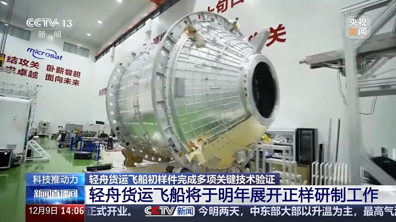 轻舟货运飞船初样件今年6月完成设计评审后,正式转入了初样研制阶段,目前各项科研工作进展顺利,预计2026年初将开始正样的研制工作。