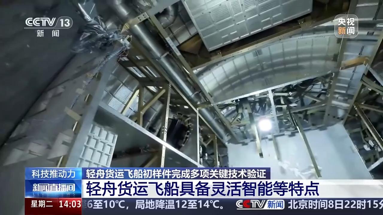 总台央视记者 帅俊全:在我身旁就是轻舟货运飞船的初样件,它的直径3.3米左右,重量是5吨,上行货物的能力达到1.8吨。可以看到轻舟货运飞船是由主体的密封舱和后段的非密封尾椎构成,这样可以在密封舱里搭载很多精密设备仪器以及生活需要物资,而在开放的尾椎上能搭载很多其他的载荷以及需要进行空间暴露实验的设备,从而使整个货运飞船的运载能力达到最佳。