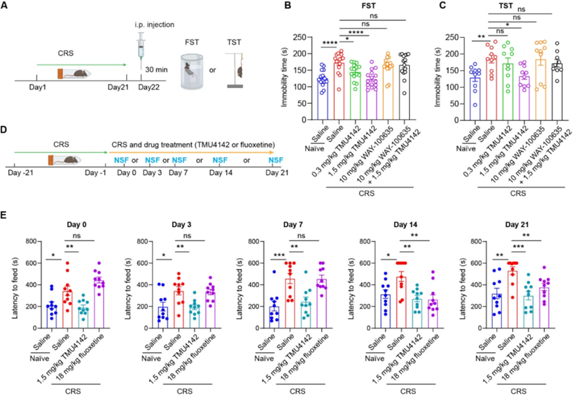研究团队以具有部分GoA蛋白激活特性的老药Pindolol为参考分子骨架,优化并合成了新候选化合物 TMU4142。在新奇食物抑制实验中,TMU4142注射1小时即可改善小鼠抑郁状态。神经化学检测进一步证实,该化合物在治疗剂量下不会引发中缝背核区域自身受体介导负反馈作用。