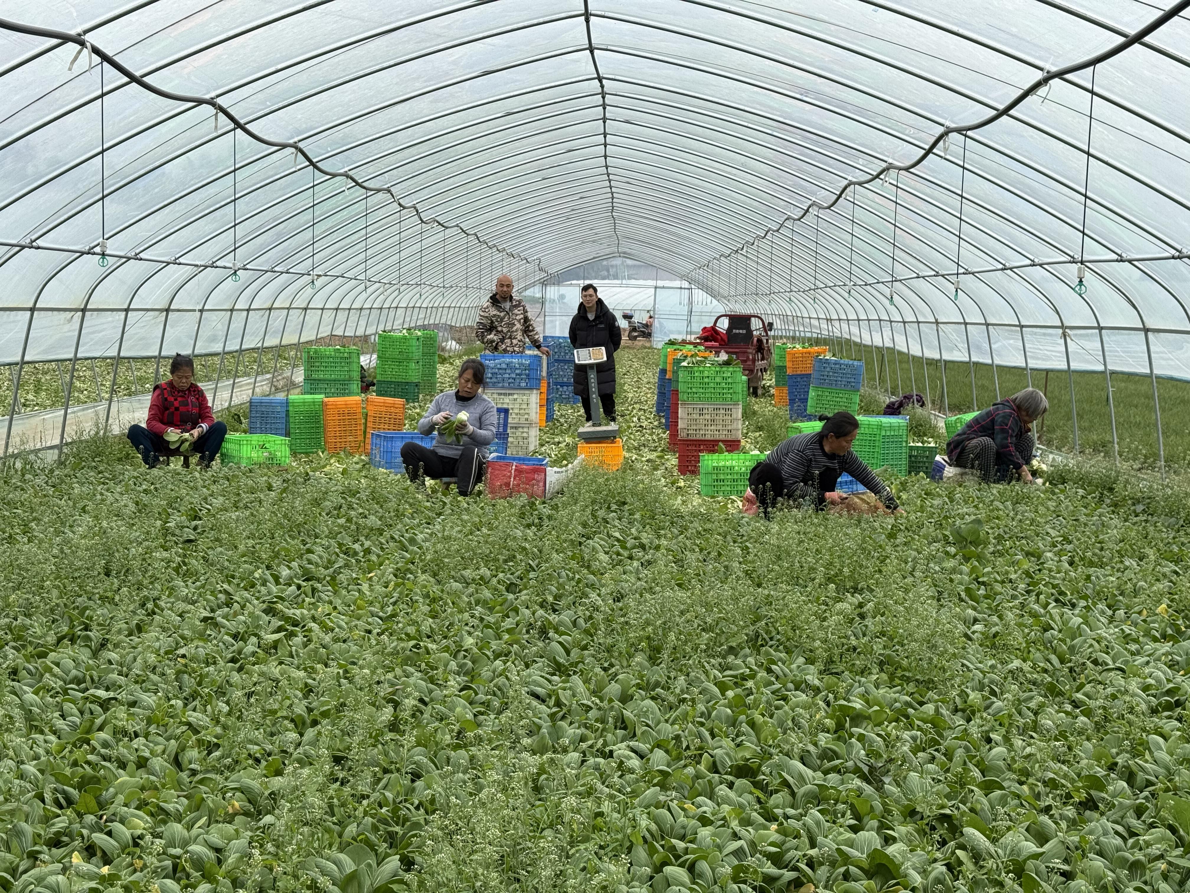 近日,在四川省绵阳市涪城区丰谷镇双木林家庭农场的蔬菜大棚内,600余亩瓢儿白迎来集中采摘期,一垄垄翠绿的瓢儿白鲜嫩水灵,工人们穿梭其间,有序开展采摘工作。