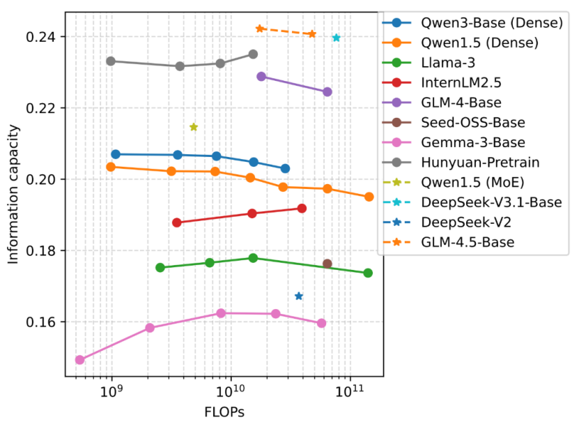信容是信息与模型参数量的比值,用于表示模型内存储的知识密度。如果把模型比作海绵,信息比作水,那么信容就如同海绵的吸水效率,水吸得越多、越快,说明模型越“聪明”。信容为比较不同架构和参数大模型的推理效率提供了量化依据,可用于高效评估不同预训练数据、模型架构和超参数的优劣。基于信容评估指标,通过对同源小尺寸模型的测试,就能预测大尺寸模型的性能表现,从而加速模型的开发和迭代。