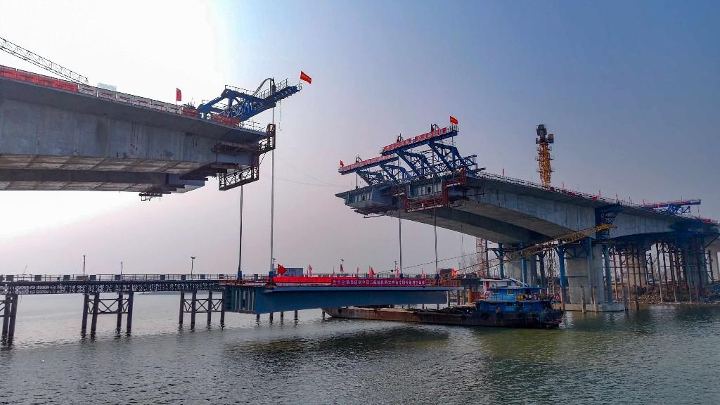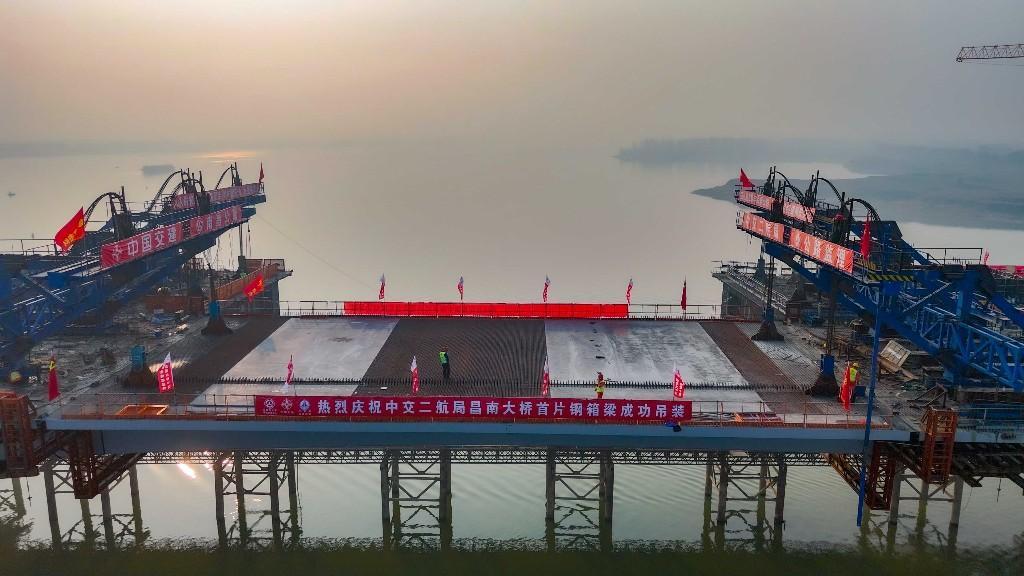 12月11日5时41分,随着一片重达520吨的钢箱梁精准吊装至指定位置,由南昌市公路事业发展中心投资建设、中交二航局承建的新南大道(G320)A标项目昌南大桥首片钢箱梁成功吊装,为后续大桥钢箱梁连续架设和桥梁合龙奠定了坚实的基础。