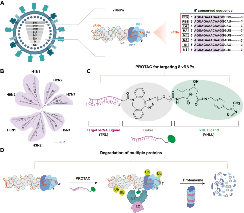 该策略的核心在于巧妙地利用了病毒RNA中一段高度保守的“通用密码”——5'非翻译区(UTR)。这段序列在不同流感病毒株中极为稳定,是病毒复制不可或缺的“开关”。刘书琳介绍:“团队据此理性设计了一种多功能PROTAC分子,它像一个精准的‘特洛伊木马’,能够同时执行识别、结合并引导降解的任务。”