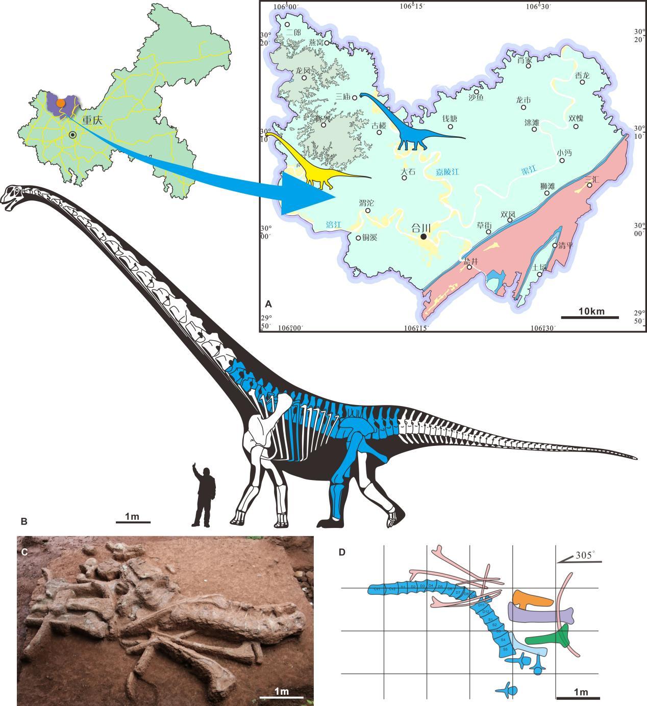 12月8日,由重庆市规划和自然资源局主持完成的一项恐龙研究成果在国际学术期刊《科学报告》上在线发表。该研究论文题为《中国西南地区上侏罗统发现的一种新的马门溪龙科蜥脚类恐龙揭示东亚真蜥脚类的新演化证据》,正式将重庆合川地区发现的大型恐龙化石命名为三江马门溪龙。