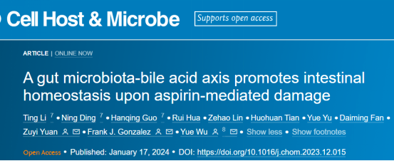 该成果发表于细胞杂志的微生物领域子刊《细胞宿主和微生物》。论文系统阐明了阿司匹林引起肠道损伤的新机制,并首次提出通过“肠道菌群—胆汁酸轴”进行干预的策略,为阿司匹林等心血管药物副作用的防治提供了全新思路。