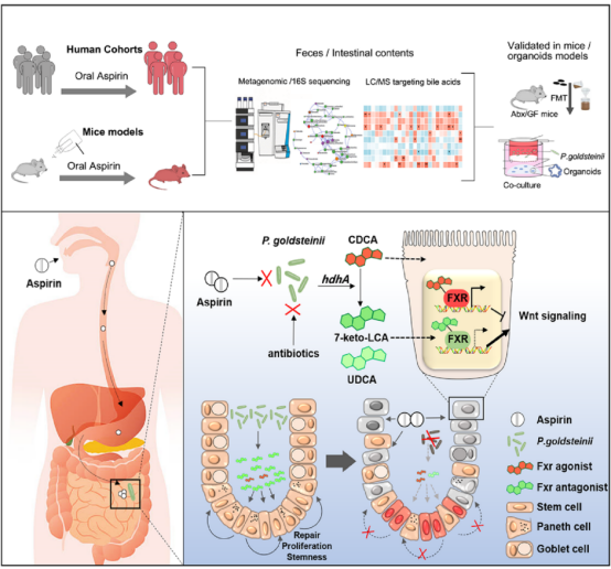 该研究由西安交通大学第一附属医院袁祖贻教授、吴岳教授以及美国国立医学院Frank J Gonzalez合作完成。团队通过整合分析临床队列多组学与动物实验结果,首次系统揭示了“肠道微生物—胆汁酸轴”在阿司匹林相关肠损伤中的关键保护作用。研究团队鉴定出一种受阿司匹林显著抑制的肠道共生菌——戈氏副拟杆菌,及其代谢产物 7-酮石胆酸(7-keto-LCA)。研究显示,后者在维持肠道稳态中发挥重要作用。实验表明,补充戈氏副拟杆菌能显著减轻阿司匹林引起的小鼠肠道屏障损伤。进一步机制研究揭示,7-keto-LCA作为法尼醇X受体(FXR)的拮抗剂,通过抑制FXR信号通路,激活Wnt信号,进而促进肠道干细胞的自我更新与上皮修复。该研究为阿司匹林相关肠病的防治提供了新的微生物—代谢干预思路:通过补充特定的益生菌(如戈氏副拟杆菌)或外源性胆汁酸代谢物,有望恢复肠道微生态平衡,减轻药物性肠损伤。
