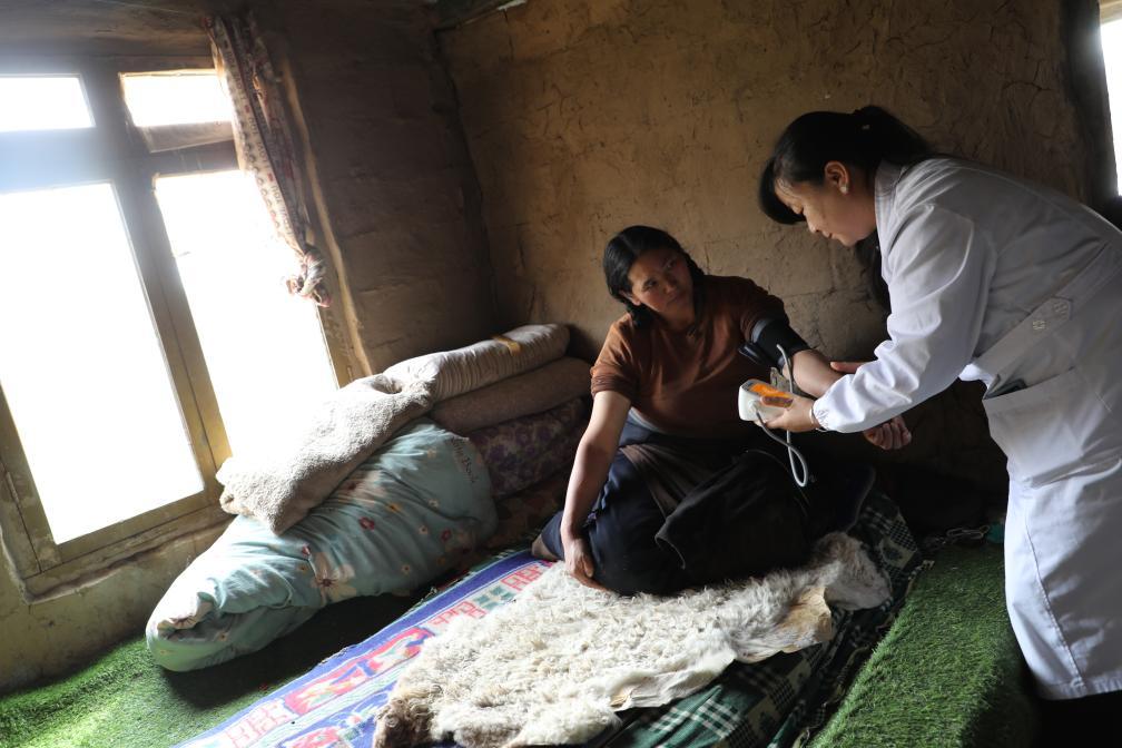 几句寒暄后,索南草口述自己的恢复近况。王蒋艳听罢,掏出血压仪,将绑带缠绕在索南草的胳膊。“康复挺好,但血压偏高,要吃降压药。”王蒋艳说。