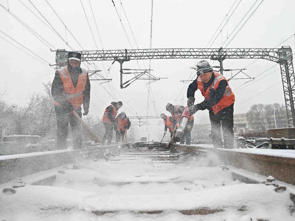 为确保列车安全运行,国铁太原局启动降雪相关区域高铁道岔融雪装置,组织对线路关键设备的积雪进行不间断清扫,加大列车走行部、制动系统等关键部位隐患排查。同时,该局安排足够人员在客流较大车站维持候车厅、站台旅客乘降、进出站秩序,采取及时清除站台及旅客通道积雪、铺设防滑垫、增加指引牌等措施,保证旅客人身安全和乘降有序。