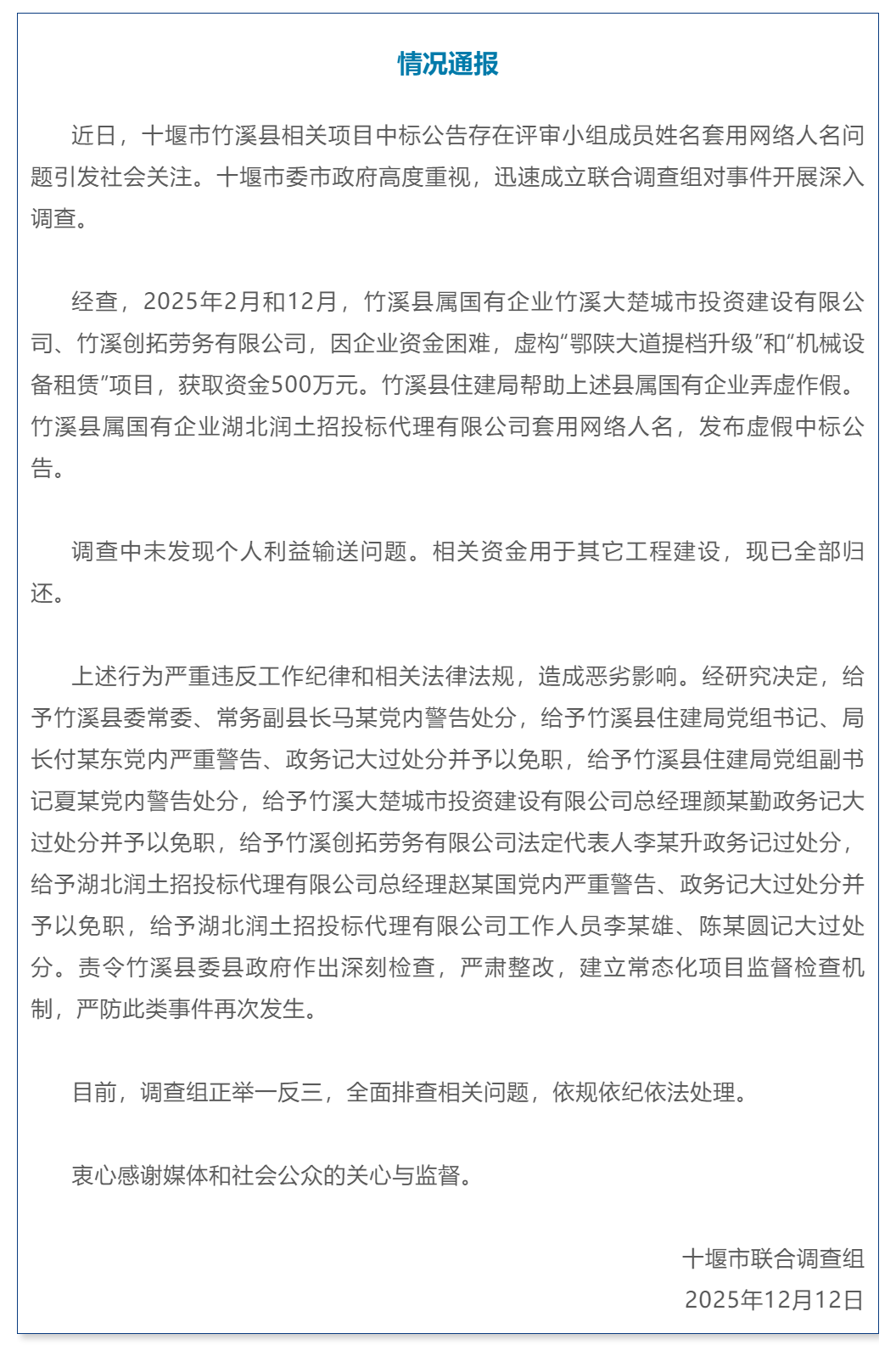 近日,十堰市竹溪县相关项目中标公告存在评审小组成员姓名套用网络人名问题引发社会关注。十堰市委市政府高度重视,迅速成立联合调查组对事件开展深入调查。