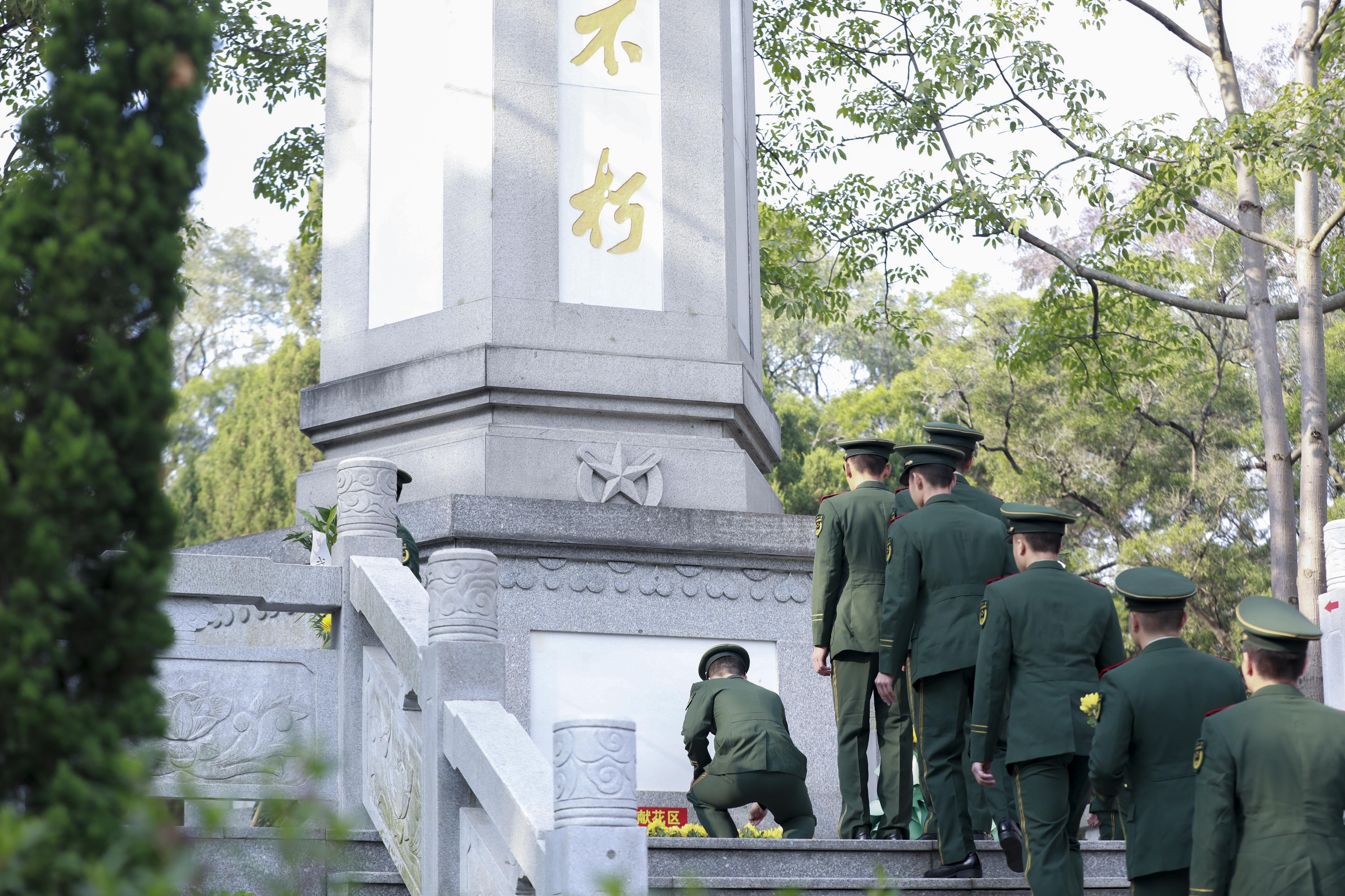 武警广西总队梧州支队组织官兵走进梧州市烈士陵园,举行公祭日悼念活动。全体官兵脱帽肃立,在指挥员的口令下集体默哀。默哀完毕后,礼兵踏着庄严的礼步,将花篮敬献于烈士纪念碑前。随后,官兵们依次上前,将手中的黄菊摆放在碑前。一朵朵小黄菊,寄托着对革命先烈的无限敬仰与追思。