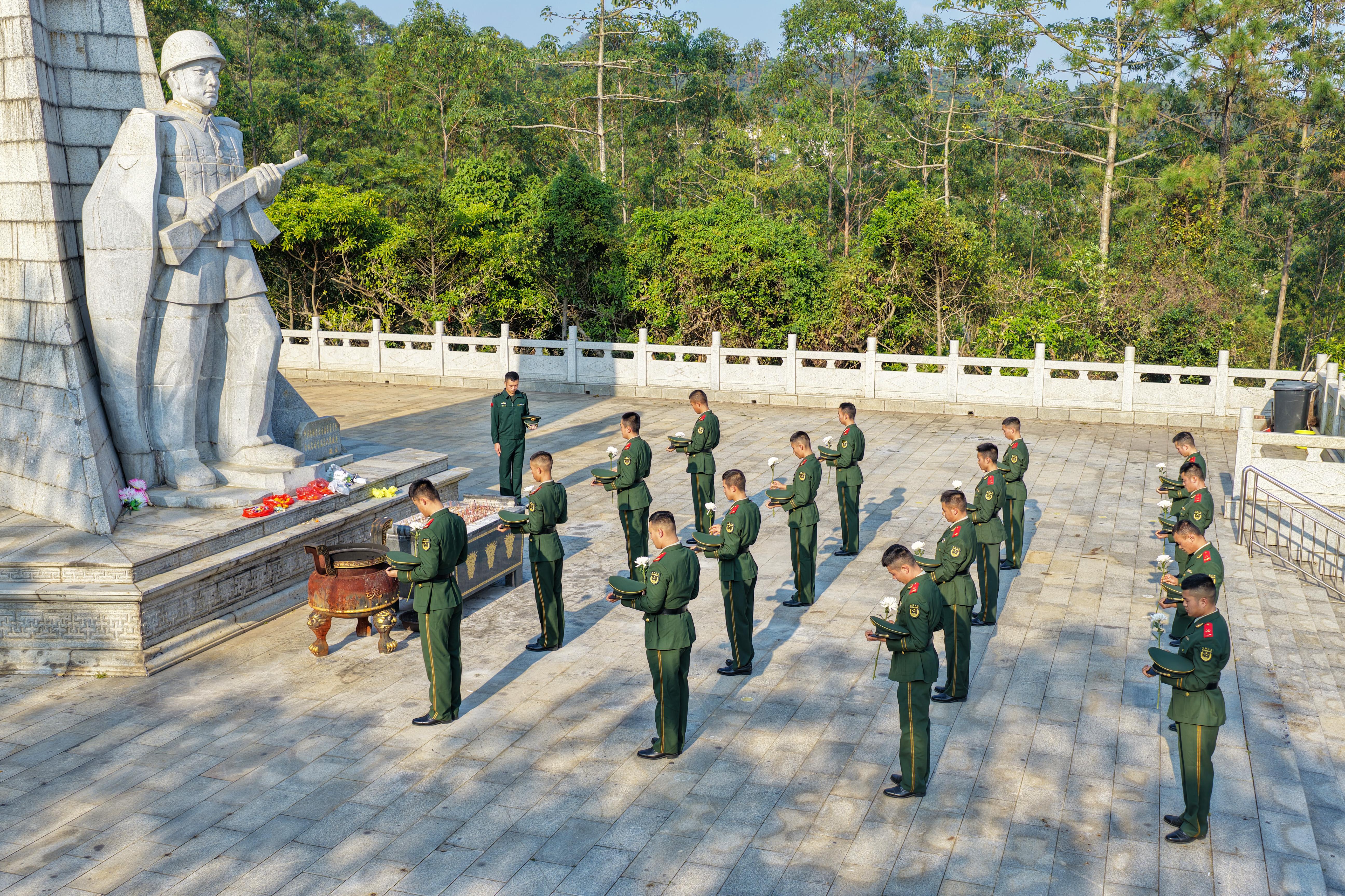 在庄严的革命烈士纪念碑前,全体官兵整齐列队、静默肃立,通过集体默哀、敬献鲜花等方式,深切缅怀战争中为民族解放英勇献身的革命先烈。