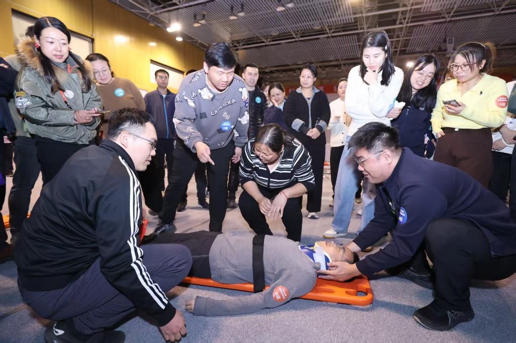 活动设置基于虚拟仿真场景的应急科普平台演示环节,来自北京急救中心、北京朝阳医院、北京同仁医院、北京明德医院的医学专家、资深护理骨干组成专业志愿团队,以“理论精讲+实操演练”的形式,为来自亦庄各社区和企业的130余名工作人员及志愿者开展系统培训,内容涵盖心肺复苏(CPR)、创伤应急处理等核心急救技能;针对居民日常可能遇到的应急场景,志愿者通过异物卡喉模拟处置、止血包扎互动体验等形式开展科普。