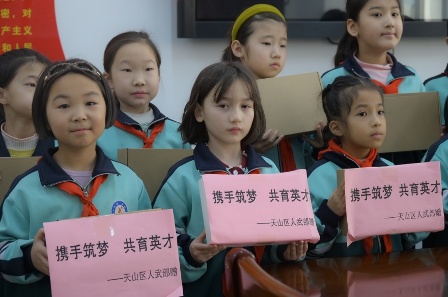 乌鲁木齐市天山区人武部还为该校21名低收入家庭但品学兼优的学生提供了助学金。四年级学生代表祖丽依曼·阿布都艾则孜说:“感谢解放军叔叔们的爱心,我们一定会珍惜这些宝贵的学习资源,努力学习,将来也像你们一样报效祖国。”