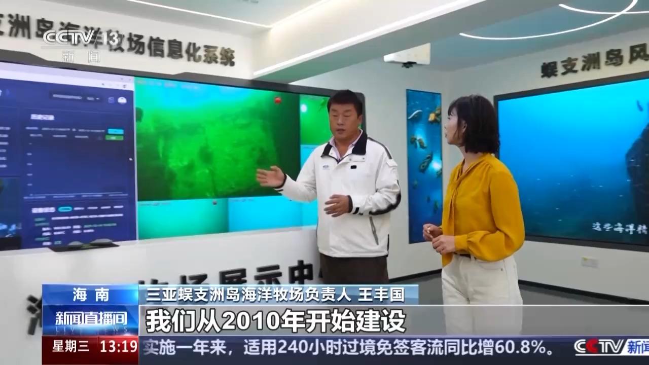 海南三亚蜈支洲岛海洋牧场负责人 王丰国:目前我们所处的位置就是蜈支洲岛海洋牧场信息化展示平台。我们从2010年开始建设蜈支洲海洋牧场,珊瑚的覆盖率由15%左右提升到37.08%。看到一片荒漠慢慢被珊瑚覆盖,这种感觉一个字“爽”。