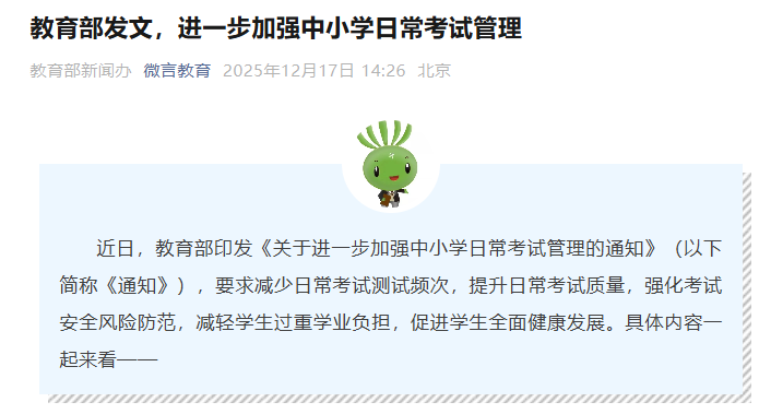 中小学日常考试,是指地方和学校在日常教学过程中,为了检验学生阶段性学习效果、服务于教学改进而面向年级全体学生组织实施的考试,不含初高中学业水平考试和普通高等学校招生全国统一考试。为贯彻落实《教育强国建设规划纲要(2024—2035年)》和三年行动计划及深化“双减”改革有关部署要求,切实解决部分地方和学校日常考试存在的管理松散、次数偏多、命题质量不高、审查不严、教考脱节等问题,减少日常考试测试频次,提升日常考试质量,强化考试安全风险防范,减轻学生过重学业负担,促进学生全面健康发展,现就进一步加强中小学日常考试管理提出以下要求。