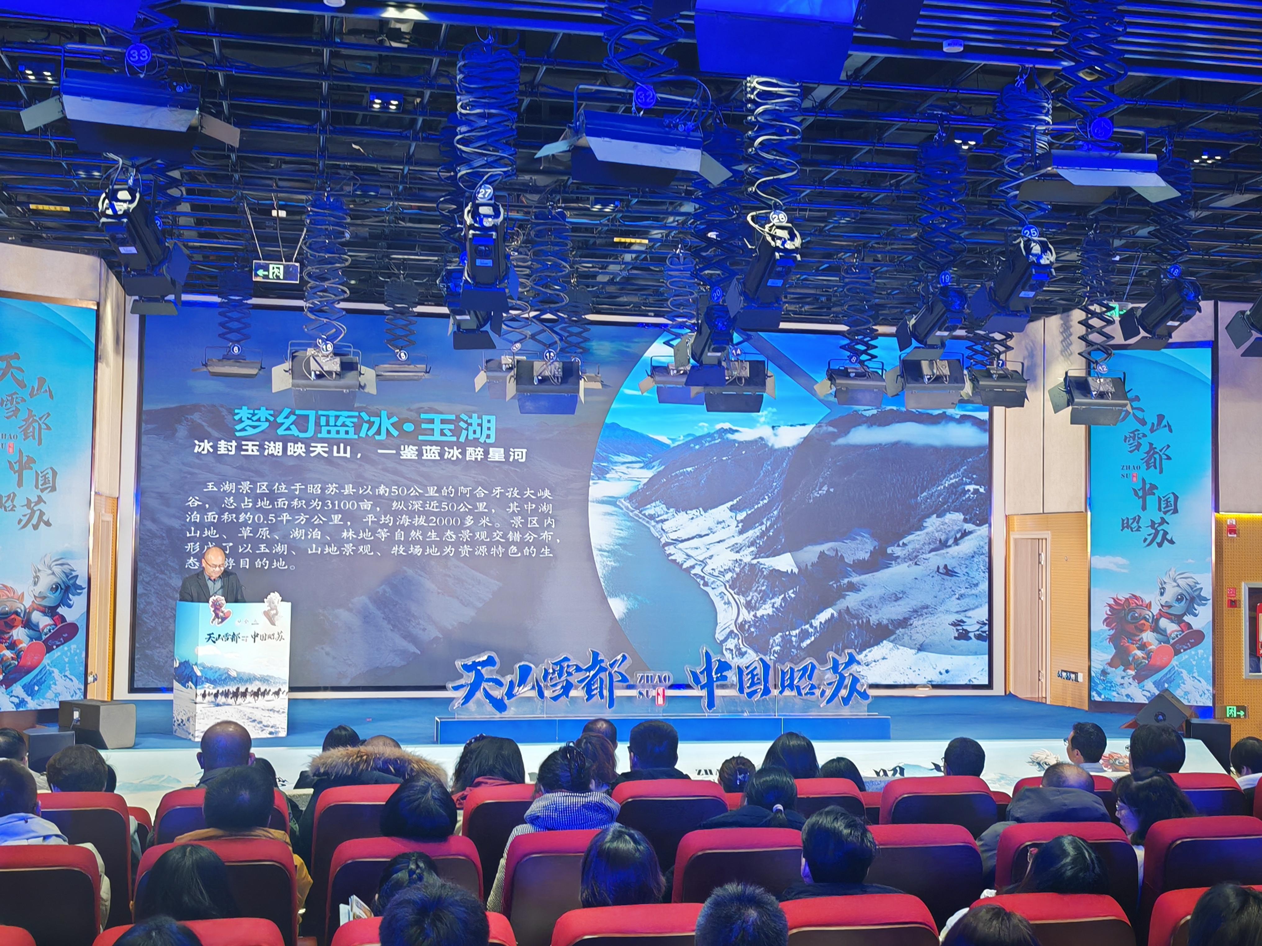 天马踏雪奔腾,卷起千层银浪,鬃毛披银挂霜的骏马在无垠雪原上嘶吼驰骋,尽显“中国天马之乡”的深厚文化底蕴;玉湖蓝冰凝翠似琉璃秘境,冰上帆船竞渡的身影穿梭其间,将自然静谧与运动活力完美交融,每一处景观都生动诠释着昭苏身处世界“冰雪黄金纬度带”的得天独厚优势。推介现场,一段4分钟的冰雪旅游宣传片震撼亮相,全方位展现昭苏“天山雪都”的独特自然禀赋与多元业态魅力。